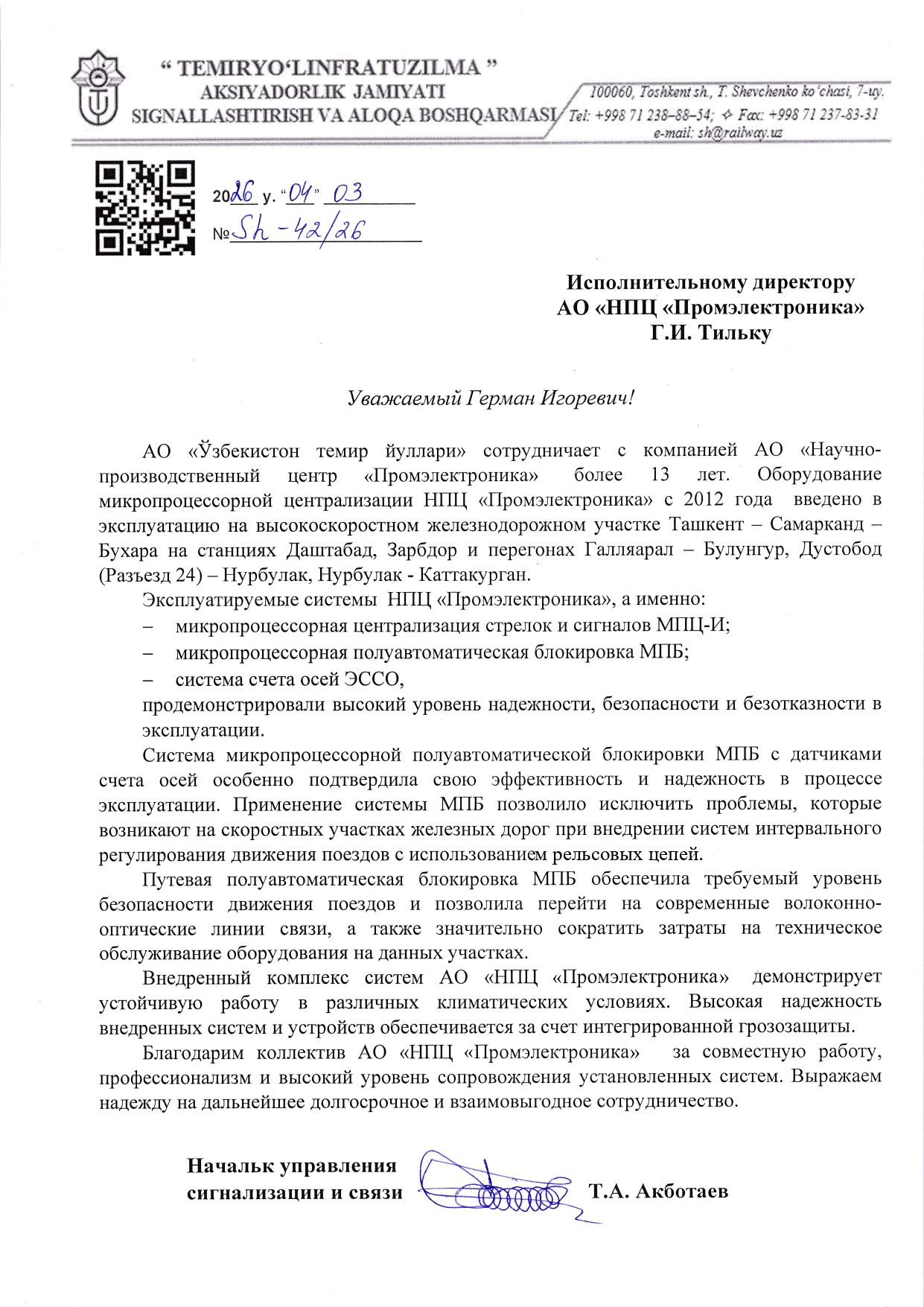 МПБАО "Узбекистон темир йуллари"Благодарим коллектив АО "НПЦ "Промэлектроника" за совместную работу, профессионализм и высокий уровень сопровождения установленных систем.Начальник управления сигнализации и связи Т.А. Акботаев -